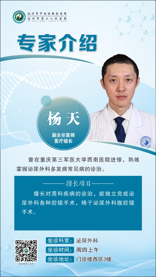 楊天,泌尿外科副主任醫(yī)師,醫(yī)療組長(zhǎng),達(dá)州市醫(yī)學(xué)會(huì)泌尿外科專委秘書(shū),參與省市級(jí)科研項(xiàng)目多項(xiàng),從事醫(yī)療事業(yè)10余年,熟練掌握泌尿外科各種常見(jiàn)病多發(fā)病的診治,擅長(zhǎng)男科專科疾病的診治。